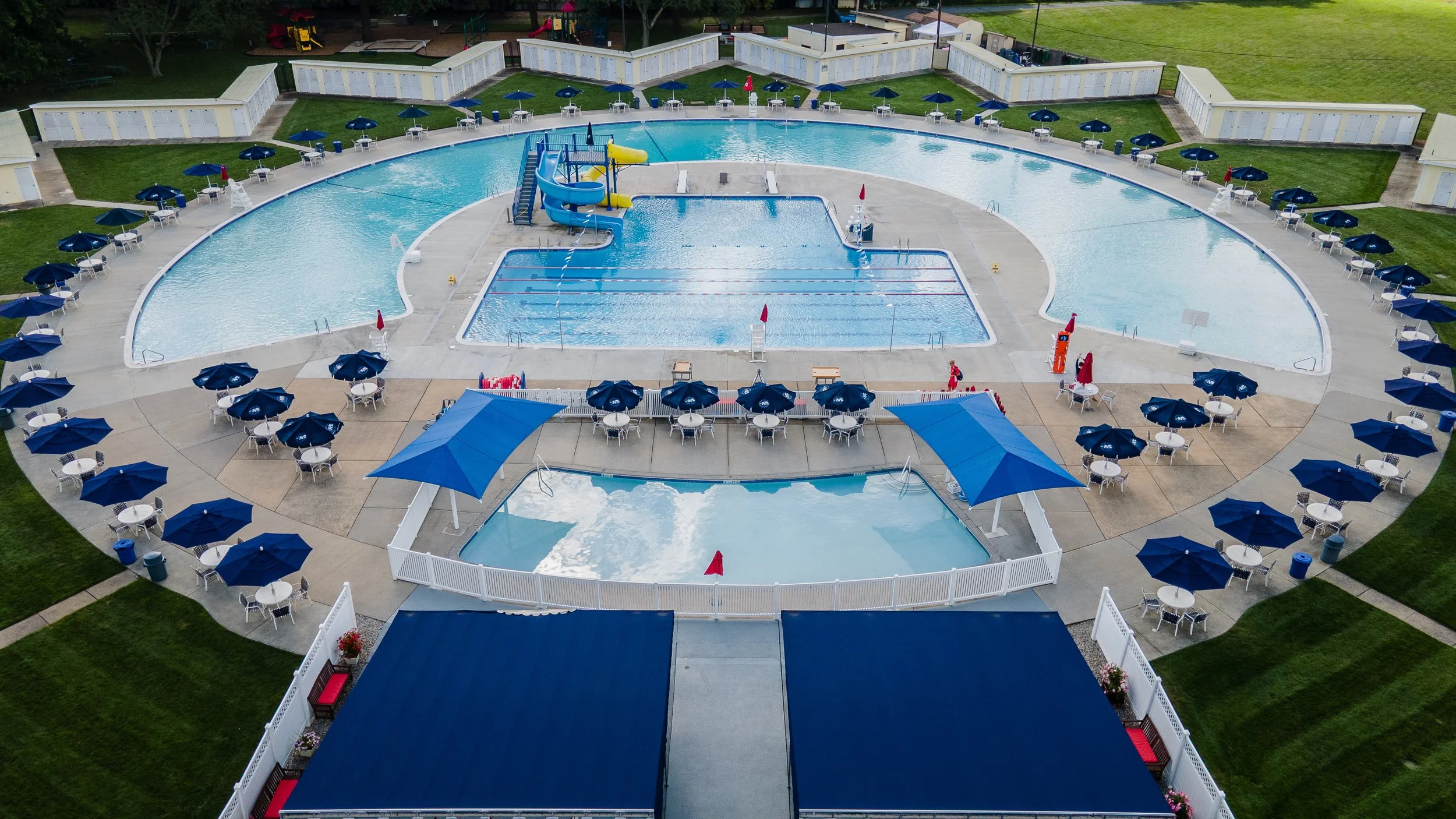 Our award-winning pools, with more than one million gallons of water, were at one time the largest poured concrete pools in the world and were featured in Life magazine. The unique horseshoe pool ranges in depth from one foot to six feet and allows for swimming, float time on designated float days, water basketball from two hoops situated on either end of the pool, and relaxing. Our separate six-lane lap pool—which has a depth of eight feet—offers lap swimming and is where our swim team practices and competes. The dive tank, with a depth of twelve feet, features two diving boards and a water slide and is where our dive team practices and competes.